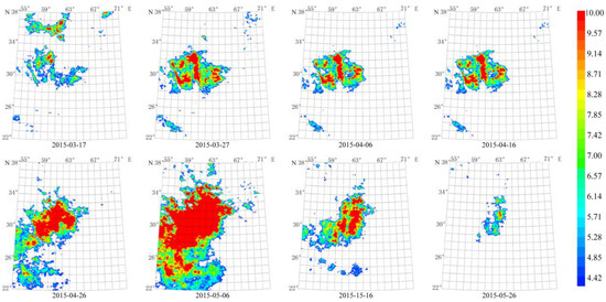 Using a longer characteristic period of 64 days, temporal and spatial evolution of thermal radiation anomalies of earthquakes in group G2 demonstrates a pattern that lasted for about 60 days, as shown in Figure 8. The maximum amplitude of the anomaly occurred on 14 September 2010. The circular anomaly appears to the southeast of the epicenter and agrees with the ShakeMap in Figure 2b.
