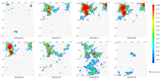 The anomaly from 26 March 2016 to 30 May 2016 with the maximum amplitude occurring from 10 April 2016 to 30 April 2016 was also closer to the double Mw 7.7 epicenter (Figure 18) and similar to that of the 16 April 2013 Mw 7.7 earthquake. The thermal radiation anomalies of the 24 September 2013 Mw 7.7 earthquake are different from that of the 2015–2016 in morphology. Specifically, the thermal radiation anomalies from the 24 September 2013 Mw 7.7 earthquake were concentrated at the epicenter and nearby areas, and the area of the anomaly was smaller (Figure 10) than that of the anomaly from 2015 (Figure 17), and less dispersed than that of the anomaly from 2016 (Figure 18). The absence of thermal radiation in 2014 might be a consequence of the Mw 7.7 earthquake in September 2013.
