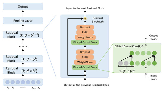 A weight-normalized layer is added after each causal and dilated convolution layer to speed up the model convergence. The ReLU activation layer activates neurons nonlinearly and adds nonlinear factors to the model to improve its feature learning ability. The Dropout layer sets the loss rate to inactivate neurons proportionally and randomly to avoid an excessive fitting model.