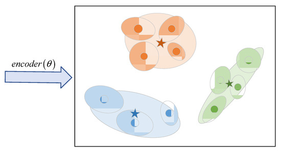 As shown in Figure 3, an RSSI vector is mapped to its embedding vector (dot) by the encoder. Its covariance matrix (ellipse) is also output by the encoder. An overall covariance matrix for each class is then computed (large ellipses), as well as prototypes of the classes (stars). Different colors represent different classes.