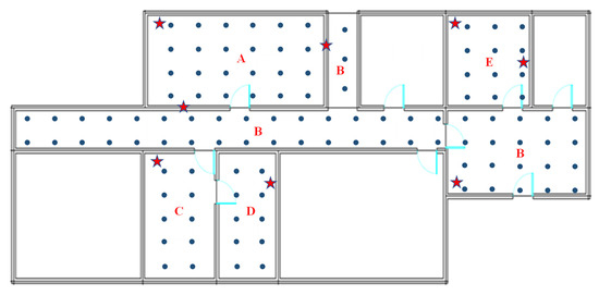 The experimental environment is illustrated in Figure 4. The experiment area covers approximately 164 square meters, including rooms A, B, C, and E, and corridor B. There are eight APs (indicated by the red stars in Figure 4) deployed in the experiment area. The grid of RPs in the environment area includes 111 points with spacings of 1.5 m (indicated by the blue spots in Figure 4). During the offline phase, we collected 110 RSSI samples at each RP. During the online phase, we set the time window to 10, meaning each positioning target keeps 9 historical RSSI measurements and 1 current RSSI measurement. The sampling interval is set to 1 s, which allows us to obtain the latest RSSI value from the underlying hardware. Otherwise, we may obtain the cached RSSI values from the previous measurement instead of the current one.