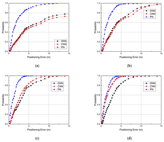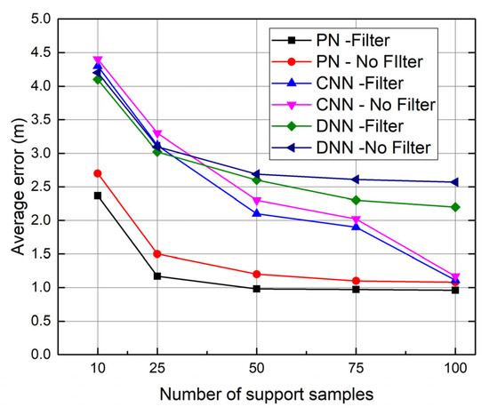Figure 5 illustrates the comparison results, where mp is the number of support samples for each position. We can see that our method performs better than these methods. The CDF curve of the PN is steeper than that of the DNN and CNN, regardless of the value of mp. Compared to the DNN and CNN, the performance gain of the PN increases as the number of support samples decreases. When the value of mp is 10, the average errors of the DNN and CNN are 4.2 m and 4.4 m, respectively, twice as much as the average error of the PN, 2.3 m. When the value of mp is 25, the average errors of the DNN and CNN are 3.1 m and 3.3 m, respectively, two times larger than the average error of the PN, 1.19 m. This proves that a small number of samples can cause the trained DNN and CNN model to overfit, which leads to a larger error. The PN-based model can take the advantages of few-shot learning to achieve a low error with a few samples. As the value of mp increases, the errors of the DNN and CNN are reduced. When the value of mp is 50, the average errors of the DNN and CNN are 2.69 m and 2.3 m, respectively. When the value of mp is 100, the average errors of the DNN and CNN are 2.57 m and 1.17 m, respectively. The CNN performs better than the DNN due to its residual architecture allowing a better application of the backpropagation training. Our PN still performs the best. When the values of mp are 50 and 100, the average errors of the PN are 0.98 m and 0.96 m, respectively.
