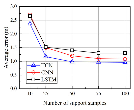 To investigate the impacts of the encoder selection on the final positioning error, we compare our TCN-based encoder with CNN-based and LSTM-based encoders. Figure 6 illustrates the comparison results. A CNN is a widely used encoder structure in prototypical networks. Here, the compared CNN has eight convolutional layers, and the convolutional kernels in these layers are 16, 16. 32, 32, 32, 64, 64, and 65, respectively. The size of the convolutional kernel is 5, and the size of the pooling kernel is 3. LSTM is widely used in sequence processing tasks. The compared LSTM has 100 hidden units.