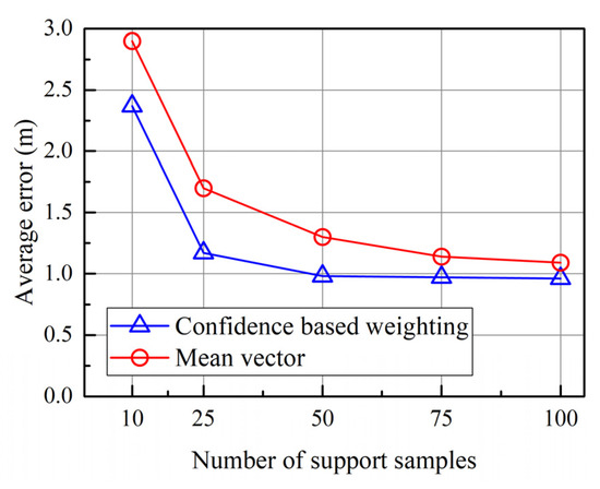 As shown in Figure 7, the average error of the confidence-based method is lower than that of the mean vector method, no matter the number of support samples. When the number of support samples is small, a few low-quality samples may have significantly negative effects on the results. Therefore, the error decreases more significantly. When the number of support samples is 10, the average error decreases from 2.9 m to 2.37 m. When the number of support samples is 25, the average error decreases from 1.7 m to 1.17 m. When the number of support samples is 50, the average error decreases from 1.3 m to 0.98 m. Although the decreasing trend slows with increasing support samples, the confidence-based method performs better than the mean vector method. When the number of support samples is 100, the average error decreases from 1.09 m to 0.96 m. This is because the negative effect of low-quality samples still exists, and our method can mitigate this effect.