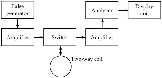 The PI (Pulse Induction) technique uses a single-loop antenna with alternating transmission and reception modes or two combined wide-span 2D loop antennas. It is based on the response of the electromagnetic field parameters to the medium’s intrinsic or surface impedance when an electromagnetic wave propagates in the soil or above ground. The reradiated signal is analyzed, generated in a metal object by eddy surface currents under the impact of an external electromagnetic field. Figure 8 shows a simplified flowchart of a pulse metal detector implementing the pulse induction technique.
