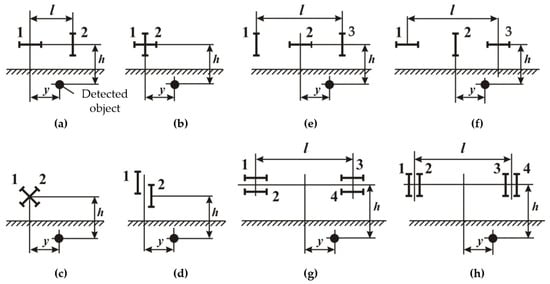 In urban environments with specific problems of detecting local SOs, the size and location depth of which are commensurate with the metal detector loop antenna dimensions, it is advisable to use quicker metal detectors with a small base for preliminary detection. Herewith, a necessary condition for the effective solution of these problems is, primarily, providing a reliable and time-stable primary field compensation at the receiving antenna location or the signals excited in the receivers by this field. Two basic mutual arrangements of coils with perpendicular and crossing axes (Figure 12a,b) are most commonly used to solve these problems, where the signal is not directly transmitted from one coil (transmitting) to another (receiving).