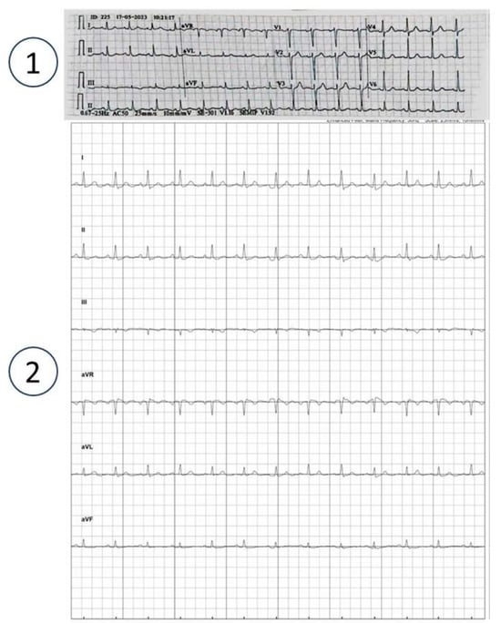 Comparison between a 6-lead ECG device’s automatic output (number 2) and that of a 12-lead for the same patient (number 1).