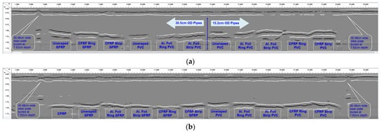 Similar to the carbon fabric, aluminum foil was wrapped around some of the PVC and GFRP pipes (in the form of strips and rings) to create a dielectric contrast between the pipes and the surrounding soil when buried. The first configuration involved wrapping 7.19 cm (2.83″) wide aluminum foil tapes around three PVC pipe samples (30.48 cm, 15.24 cm, and 7.62 cm diameters) and two GFRP pipe samples (30.48 cm and 7.62 cm diameters), at a clear spacing of 7.62 cm (3″). The second configuration involved placing an aluminum foil strip along the lengths of three PVC pipes and two GFRP pipe samples similar to the carbon fabric strips. Figure 2c,d show a 30.48 cm (12″) diameter GFRP pipe with aluminum rings and a 30.48 cm (12″) diameter GFRP pipe with an aluminum strip along the length, respectively. The aluminum foil overlays will be especially useful for PVC pipes since these aluminum foil tapes are readily available in hardware stores that sell PVC pipes, and the aluminum tapes can be bonded easily to the already manufactured PVC pipes.