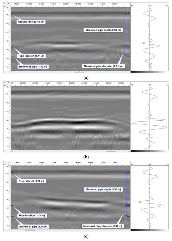 Longitudinal GPR scans over the pipe trenches using 200 MHz antenna. (a) Longitudinal GPR scan along the full length of 30.48 cm (12′) and 15.24 cm (6″) diameter pipes with 91.44 cm (3 ft) of soil cover. (b) Longitudinal GPR scan along the full length of 30.48 cm (12″) diameter pipes with 122 cm (4 ft) of soil cover. (c) Longitudinal GPR scan along the full length of 7.62 cm (3″) diameter pipes with 61 cm (2 ft) of soil cover. (d) Longitudinal GPR scan along the full length of 30.48 cm (12″) and 25.4 cm (10″) diameter pipes with 61 cm (2 ft) of soil cover.