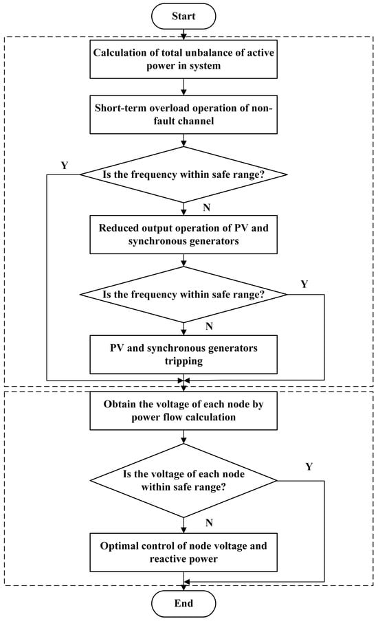 Ref. [] puts forward the primary frequency regulation control strategy of the system based on the analysis of the frequency response after the DC channel is disconnected, but it does not take into account the active regulation ability of new energy units. Jingzhe Tu, of the China Electric Power Research Institute, discussed the mutual restriction between distributed generation and a flexible interconnection system and the supporting role of synchronous units []. Shuyong Chen, of the China Electric Power Research Institute, put forward a control scheme for generator tipping, aiming at the goal of maintaining transient stability after system failure, pointing out that it is difficult to ensure stability or the cost is too high to just remove thermal power after a serious failure, so some distributed power sources should also be removed []. Yun Chen, of the North China Electric Power University, designed a scheme combining wind–photovoltaic–thermal energy with a high-frequency generator tripping to adapt to the fluctuation of wind speed and lighting []. Although the control strategies proposed by them partly involve the coordinated control of new energy units and conventional units, they only start from the point of view of generator tripping, and neither of them considers the power control of distributed power sources. Cutting off the new energy unit will cut off the reactive power source of the system accordingly, which will bring inconvenience to the voltage emergency control and the system will need to be connected to the grid again after the fault.