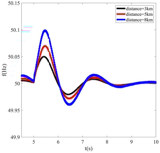When other conditions of each photovoltaic unit are the same, but the electrical distance to the flexible interconnection device is different, the system load is set to decrease by 200 kW, step by step, at t = 5 s, and the changes in system frequency under various conditions are compared and analyzed.