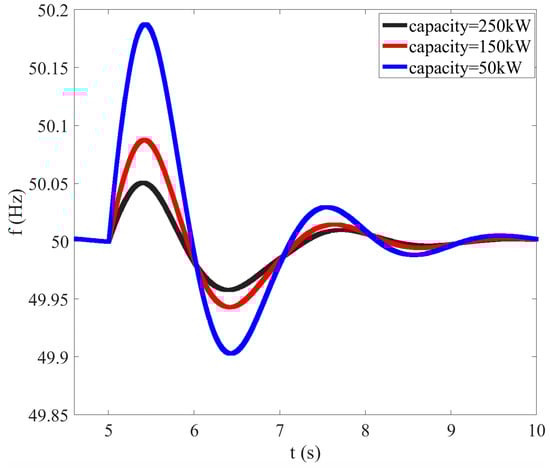 The system load is still set to decrease by 200 kW, step by step, at t = 5 s, and the changes in system frequency under various conditions are compared and analyzed.