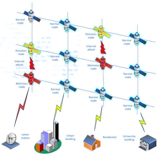 As shown in Figure 1, the satellite network routing attack architecture consists of the low-Earth-orbital satellite (LEO) network and the corresponding ground infrastructure (urban building and satellite receiving stations). Among them, the nodes of the LEO will be attacked by routing, which will pollute the data flow, and then affect the data communication of the entire space–Earth network. The red satellite node in the figure indicates that it has been invaded and become a malicious node. The yellow satellite node indicates a communication interruption or information loss due to a malicious attack by a red satellite node. The remaining blue satellite nodes indicate normal satellite nodes. Because the satellite network will be attacked by malicious nodes during the routing process, this article uses a trust model to strengthen the routing algorithm. In this way, the satellite network route established by the trust model can actively identify and avoid malicious nodes, and can effectively establish a secure route, thus improving the security of the satellite network route.