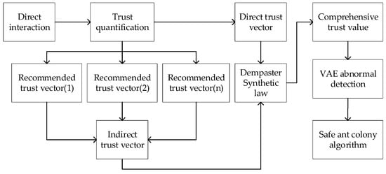 Since the satellite network is subject to internal attacks during the routing process, to cope with such malicious attacks, this paper proposes to build a security trust model on the satellite to reinforce the routing. The structure is shown in Figure 2. To identify the malicious attack behavior, the interaction information between nodes should be collected and should be used as trustworthy evidence by the quantity of interaction information, then the direct trust and indirect trust vectors can be established. When the VAE network is trained, it needs a clean trust vector as a dataset, so this paper first uses D–S evidence theory to clean the trust vector. After the VAE network is trained successfully, the VAE network is used to identify the collected trust evidence for malicious purposes. Finally, the ant colony algorithm can use the security factor to combine with its pheromone in the routing process, so as to identify malicious nodes and establish a secure route.