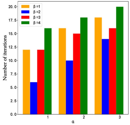 A larger information prime weight factor will weaken the ability to search for other paths in the ant colony algorithm, while the smaller value can easily cause the ant colony algorithm to fall into a locally optimal solution. Similarly, a larger inspiration factor will weaken the role of pheromone in the algorithm process, leading to the local optimal solution; and the smaller will turn the ant colony algorithm into a simple random search. Therefore, the appropriate value of and should be determined by experiments. According to the experimental results (Figure 4), we found that when = 1, = 2, the ant colony algorithm has the minimum number of iterations, so we chose this set of parameter values.
