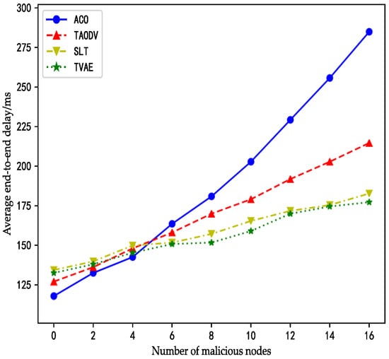 Average end-to-end delay refers to the time it takes for a packet to be sent from the source node to the destination node. After setting the number and type of malicious nodes in NS2 simulation software, the end-to-end delay data of satellite network routing can be obtained. As shown in the figure below, when there are no malicious nodes in the network, the benchmark algorithm ACO does not introduce a security trust model to harden it, thus saving additional computing time of trust value. Therefore, the average end-to-end delay of the ACO algorithm is the lowest among the four curves. TAODV, SLT, and TVAE all need to carry out security hardening of the trust model. Therefore, when there is no malicious node, the average end-to-end delay has a corresponding time consumption.