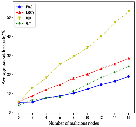 The packet loss rate refers to the ratio of the number of packets lost in the process of data transmission to the number of packets sent. As can be seen from the figure below, when there are no malicious nodes in the satellite network, the packet loss rates of the ACO algorithm, TAODV algorithm, SLT algorithm, and TVAE algorithm are not much different. At this point, packet loss may occur due to normal factors such as network topology changes, or it may be caused by queue congestion.