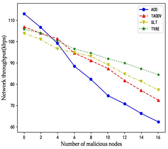 As indicated in Figure 8, when the number of malicious nodes is 0, the ACO algorithm exhibits the highest network throughput, surpassing the TAODV algorithm by 7 kbps, the TVAE algorithm by 8 kbps, and the SLT algorithm by 11 kbps. The reason behind this outcome is the absence of time overhead due to a security trust model in the ACO algorithm, allowing it to process more task requests within a unit of time. However, as the number of malicious nodes reaches four, the network throughput of the ACO algorithm becomes lower than that of the TAODV and TVAE algorithms. Furthermore, with an increase in the number of malicious nodes, the ACO curve steadily declines. Ultimately, when the number of malicious nodes reaches 16, the network throughput of the ACO algorithm drops to only 60 kbps.