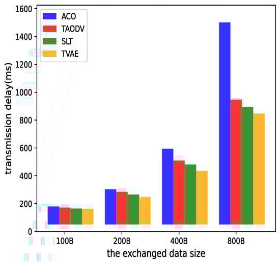 To test the latency of data transmission under different traffic conditions, this study increases the length of the packets themselves to provide a performance comparison of various algorithms in this scenario. Since the comparative algorithms require the running of a secure trust model, this paper selects a malicious node count of eight for processing here. Ensuring the presence of malicious interference makes the simulation results more convincing.