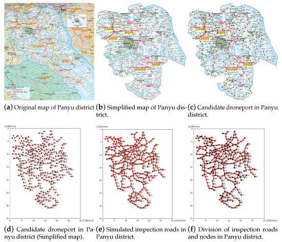 Since the network complexity of the provincial and county roads is much higher than that of the expressway networks, this paper mainly focuses on the provincial and county roads. Firstly, we need to settle the distance between distributed droneport candidate points along each road on the manually processed map of the Panyu district as the candidate points for the droneport as shown in Figure 2c. Given that the relatively economical flight speed of the UAV is 50 km/h and the maximum flight time is about 55 min, a distance greater than 5 km between two candidates can seriously affect flight safety, while a distance lower than 1 km may lead to large amount of distributed droneport candidates, and further, huge computation. Thus, we set such a distance to 3 km to achieve a good balance between the flight safety and reasonable computation by using the U880 UAV of Guangzhou Youfei Information Technology Co., Ltd. (Guangzhou, China) for conducting road inspection in experiments. Then, we collect the coordinates of all the candidate points and present the serial number for them as shown in Figure 2d. The numbers on the horizontal and the vertical axes refer to the corresponding coordinates, and the 1 unit on the coordinate axis represents 2.22 km. With the upper left corner taken as the origin node, the positions of the candidate points are represented by the corresponding horizontal and vertical coordinates.
