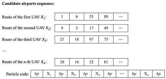 With the route represented as a sequential order of the candidate droneports, e.g., , the routes for n UAVs include n sequences of the candidate droneports. We combine these n sequences together into a single one to retrieve the particle encoding as illustrated in Figure 3, where is the breakpoint to separate the routes of different UAVs.