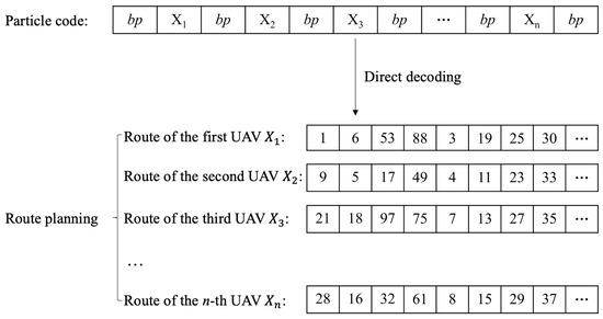 The direct decoding strategy aims to extract the planned routes for UAVs from the particle encoding information. As designed in Section 6.1, the particle encoding is combined with multiple solutions of UAVs with some breakpoints to differentiate them. Thus, the encoding information could be directly decoded to retrieve the planned routes of UAVs by separating the particle encoding according to the breakpoints as shown in Figure 4.