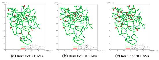 In Figure 6, the green lines refer to the routes that need the inspection, the red lines refer to the overlapped inspection routes in a global inspection cycle and the blue lines refer to the UAV routes planned by the proposed algorithm. We can find that the planned UAV routes could cover all the routes in the region, which demonstrates that the proposed method can plan reasonable routes for the global inspection. Thus, we conclude that the proposed method is feasible for route planning. In Figure 7, the green lines refer to the routes that need the inspection, where the lines cross in blue refer to the droneports that are used only once during a global inspection cycle and the red line crossings refer to the droneports that are used multiple times during a global inspection cycle. We can observe that the selected droneport sites are all near the planned routes, and some droneports are repeatedly used for different numbers of UAVs, which reduces the number of droneports and further saves the construction costs. The observations demonstrate that the proposed method could select reasonable droneport sites and show the feasibility of our method in droneport site selection.