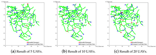 We first retrieve the calculations carried out in the case of 5, 10 and 20 UAVs and the corresponding best particles. Then, we illustrate the route planning results and the droneport site selection results of the UAVs, which are obtained by decoding the best particles with different numbers of UAVs in Figure 6 and Figure 7, respectively.