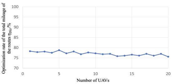 Figure 9 shows that the optimization rate of the total mileage of the UAV routes slightly decreases as the number of UAVs increases, where the optimization rate fluctuates around 76%. We could conclude that under different numbers of UAVs, the proposed method plans the routes with a consistent and promising optimization effect on the total mileage of the routes. This result elucidates that, when employing our route planning method, the cumulative mileage of the routes maintains a remarkable level of stability even as the number of drones escalates. This steadfastness in route mileage holds the potential to foster a consistent maintenance cycle for the UAV fleet, consequently yielding a reduction in overall management costs.