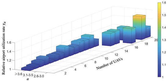 Based on the 20 best particles found in Experiment 2, we decode these particles and obtain the selected droneport sites under different numbers of UAVs. We further compute the relative droneport utilization rate under different numbers of UAVs based on the selected droneport sites. Then, we illustrate the relative droneport utilization rate under different numbers of UAVs in Figure 10.