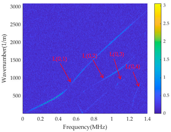 Due to the multi-mode property of the ultrasonic guided wave, the time domain signal of each signal-receiving point is a complex wave coupled by multiple modes. Furthermore, the ultrasonic guided wave displays dispersion, where the propagation velocity of each mode varies with frequency. Consequently, extracting meaningful information solely from the time domain signals is challenging. In this regard, 2D-FFT extends one-dimensional Fourier transform directly to multidimensional signals, making it an effective method for analysing signals in the time–space domain. By 2D-FFT, the waves coupled together in the time domain can be separated from each other in the f-k domain, allowing for the waveform decoupling. Then the desired modes can be separated in the f-k diagram, enabling the study of the dispersion phenomenon exhibited by each mode of the ultrasonic guided wave: