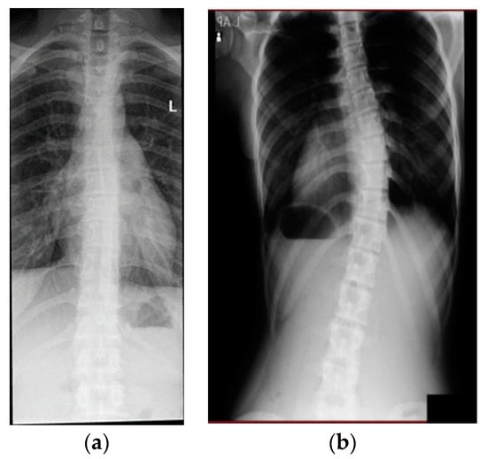 (a) Normal spine (case courtesy of Craig Hacking, Radiopaedia.org, rID: 40136, accessed on 9 October 2023). (b) Adolescent idiopathic scoliosis.