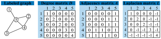 Other than the adjacency matrix A, the graph can be defined as a Laplacian matrix with L = D − A, where D and A denote the degree matrix and the adjacency matrix, respectively. The adjacency matrix and degree matrix are calculated as shown in Figure 1. The degree matrix indicates the number of connected nodes. For example, with node one having one edge and node five having four edges. The adjacency matrix represents the relationship between nodes. For example, node one and node five are connected and represented by one, while node one and node two are not connected and represented by zero.