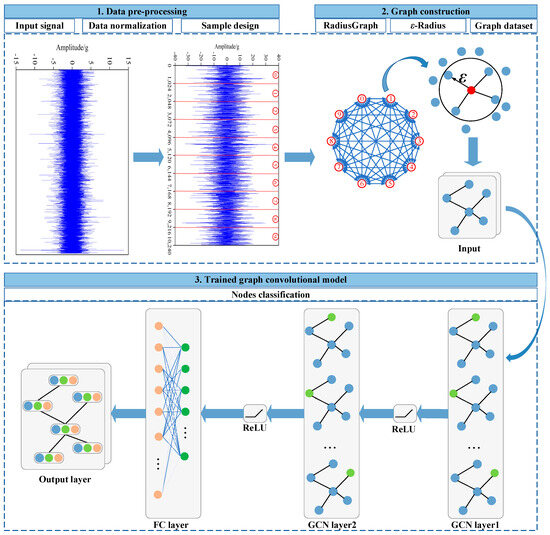 Inspired by this, graph neural networks (GNNs) were introduced to extend CNNs to graph data [10,11] to solve the above problem. The GNN was first proposed by Scarselli et al. in 2009 [12] and is based on graph theory to construct a neural network for data in the graph domain. In the graph domain, using the attributes of nodes and edges can provide additional information to improve the extracted features. In addition, the noise immunity has been improved. As a result, more information can be provided in a graphics field than in a general data field. Bruna et al. [13] introduced convolutional operations to GNNs which are based on spectral graph theory and constructed the first graph convolutional network (GCN) model. Compared with traditional CNN methods, GCN has advantages in dealing with non-stationary, non-linear signals and discriminative feature extraction of discrete spatial domain signals [14]. Up to now, the GCN method has been successfully applied to several research areas such as intelligent acoustic fault diagnosis of rolling bearings [15] and wind turbine gearbox fault diagnosis [16,17,18]. The main research focus of this paper is how to construct the original vibration signal into graph-structured data. Secondly, the GCN model’s feature mining capability is utilized to eliminate the screening feature link in fault diagnosis and improve the efficiency of composite fault diagnosis.