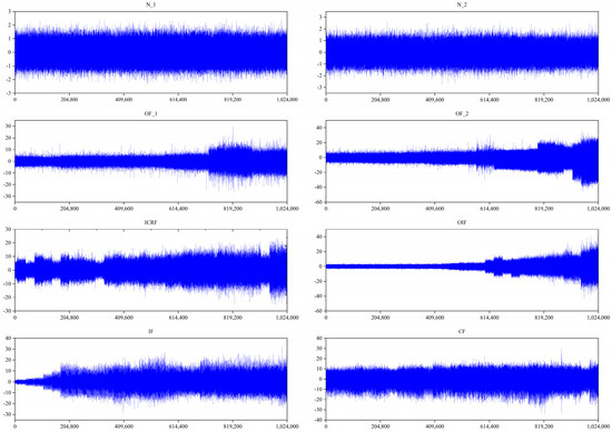 The vibration signals collected from the XJTU-SY test stand are shown in Figure 5 and are pre-processed. First, the original signal was subjected to a max-min normalization process. Second, a sliding window was used to intercept non-overlapping vibration signals, with each sub-sample containing 1024 data points and 1000 samples for each fault type, for a total of 8000 samples for the eight fault types. Finally, each sub-sample was FFT transformed and labeled accordingly. The division of the training and test sets is shown in Table 2. Dataset A contains two working conditions, the fault types of condition one include normal, outer ring fault, cage fault, and composite fault of inner and outer rings. The fault types of condition three include normal, outer ring failure, inner ring, rolling element and cage composite failure, and inner ring failure. Diagnosis of faults in the two operating conditions was conducted separately, with 80% of the samples from each bearing health condition being used for training and the rest for testing in order to compare the same working conditions with different working conditions. In Dataset B, the data for the different working conditions were considered as a whole and only one normal bearing was considered, so that there were seven health states in total. 80% of the samples for each bearing health state were used for training and the remaining samples for testing. In practice, compound fault samples were more difficult to collect than single fault samples. Thus, in dataset C, the percentage of training samples for normal bearings was 50%, the percentage of training samples for single faults 30% and the percentage of training samples for compound faults was 20% or 10%.
