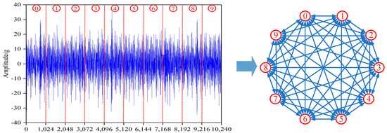 This study selected eight fault samples for two operating conditions, each one with a signal length of 1,024,000 and a sub-sample length of 1024, for a total of 1000 sub-samples. One every ten sub-samples was used to form one ε-radius of zero, and 2β2 is a graph of 1024 as shown in Figure 6. First, calculate the cosine similarity of each sample to its ten nearest neighbors and obtain the weights of the edges by Equation (18). Then, move to the next ten neighbors until all samples are traversed. Finally, move to the next ten neighbors’ nodes until all samples are traversed.