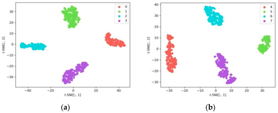 In fact, fault samples are harder to collect than normal samples, while composite fault samples are more difficult to collect than single fault samples. In this section, we used the proposed DGCN to classify the imbalanced samples and therefore consider Dataset C. The predictions of the model on the test set were visualized using t-SNE, as is shown in Figure 12, and the characteristics of the different fault types are well separated. Therefore, DGCN is able to learn better features from vibration signals. It can be seen from Figure 13 that DGCN has a very high accuracy in all the confusion matrices. These results demonstrate the superiority of this method in the classification of unbalanced samples.