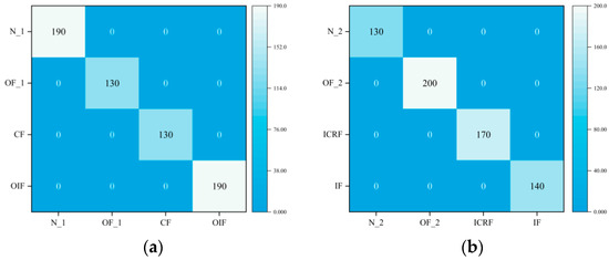 Confusion matrix for the same operating conditions. (a) Dataset A_1, (b) Dataset A_2.