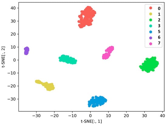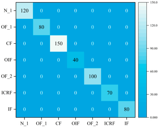 This section focuses on the performance of the proposed DGCN in terms of classification under the same operating conditions and with balanced samples. Therefore, this section considers Dataset A_1 and Dataset A_2. Figure 8 shows the t-SNE visualization results of the fault features extracted by GCN. It can be seen from the graph that this method is able to extract useful fault features under the same operating conditions and all fault types can be clearly distinguished, achieving good fault detection accuracy. The confusion matrix of the diagnostic results is shown in Figure 9, indicating that the DGCN model can effectively detect multiple faults under the same operating conditions.