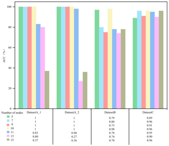The effect of the number of nodes on the accuracy of the different datasets is shown in Figure 14. It can be found that in the same working condition dataset (DatasetA_1 and DatasetA_2) testing, the accuracy rate basically tends to be stabilized when the number of nodes is 5–10 but decreases significantly when the number of nodes is greater than 15. In cross working conditions and imbalanced sample dataset testing, changes in the number of nodes had little change in accuracy.