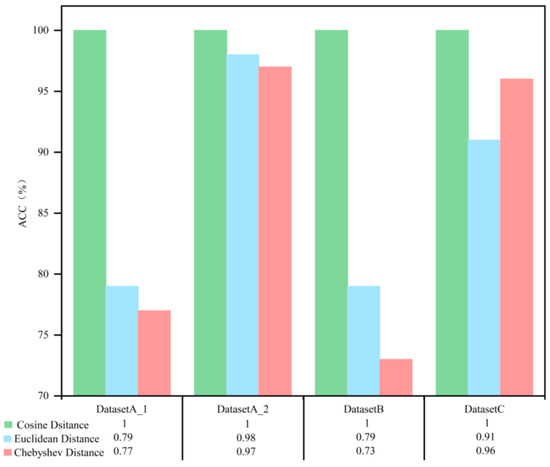 Figure 15 shows the impact of using the three distance calculation methods on the diagnostic accuracy of the different datasets. Using cosine similarity to calculate distance has the highest accuracy. In contrast, the accuracy of Euclid and Chebyshev distance calculation methods is slightly less accurate.