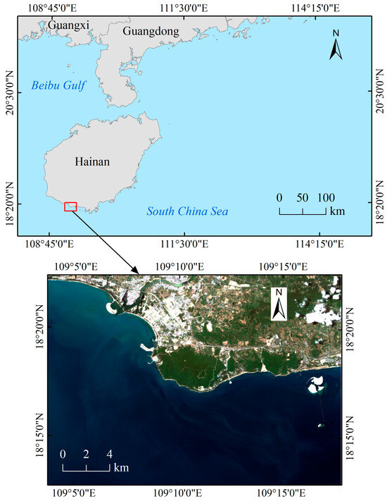 The study area is located in the southwest of Hainan Island, China, specifically in the waters near Nanshan Port (Figure 1). It is in close proximity to human settlements and experiences a high volume of maritime traffic. The water quality of this water area is poor, and the substrate type is single, so it is suitable as an experimental area for remote sensing water depth inversion.