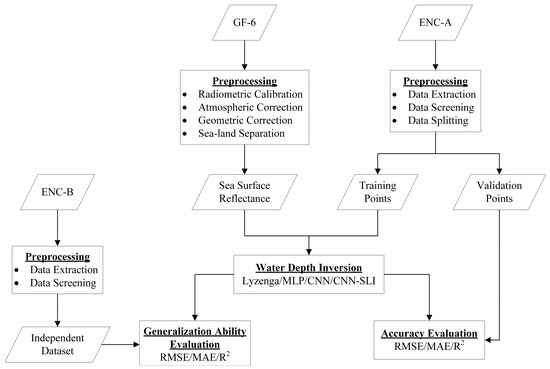This section details the processing steps involved in the water depth inversion process and the applied inversion methods. Figure 2 shows the workflow of water depth inversion.