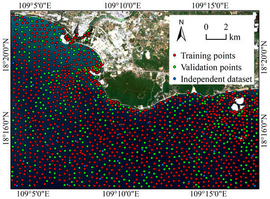 Global Mapper version 20 software was used to extract 1512 water depth points from ENC-A, which were evenly distributed in the study area. However, 45 water depth points are not distributed in the waters of the study area, and one water depth point has numerical anomalies. Therefore, Dataset A has a total of 1466 water depth points. A total of 67 water depth points located within the study area were extracted from ENC-B, so Dataset B has a total of 67 water depth points. After that, the training samples and test samples were split from Dataset A according to the ratio of 7:3 through the subset features tool of the ArcGIS software. Dataset B is used as an independent dataset to test the generalization ability of different models. The spatial distribution of water depth points is shown in Figure 3. The statistical information of water depth data is shown in Table 2.