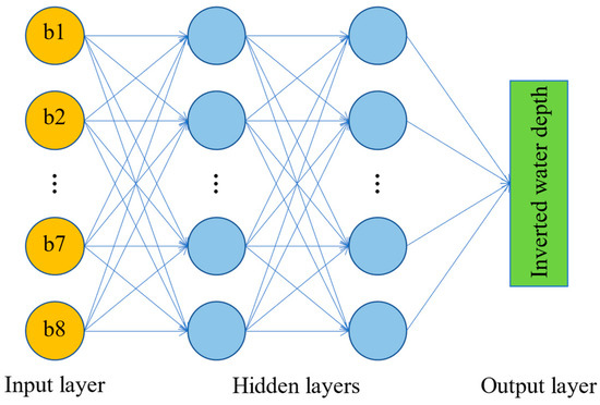 The multilayer perceptron (MLP) is a feedforward neural network commonly used in machine learning. It consists of an input layer, an output layer, and multiple hidden layers [41]. The adjacent layers are connected through weights and activation functions. The number of neurons in the input layer corresponds to the number of input features. In this article, the reflectance values of all eight bands of GF-6 are used as the input data of the MLP model, so the number of neurons in the input layer is 8. The output layer provided the water depth inversion results and had a single neuron. The MLP regression algorithm with two hidden layers was implemented using the PyTorch version 1.10.1 framework in the Python programming language. Figure 4 illustrates the structure of the MLP model. The ReLU function was chosen as the activation function for the hidden layers, and the Adam algorithm was selected as the weight optimization solver. To mitigate the risk of overfitting, a dropout layer (enabled only during training) is added behind each hidden layer, and the dropout probability is empirically set to 0.1. To determine the batch size, learning rate, number of iterations, and number of neurons in the hidden layers, Bayesian search and 5-fold cross-validation methods were employed with the Scikit-Optimize library. The prescribed values for the hyperparameters within the MLP model are shown in Table 3.