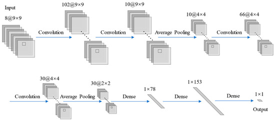 The CNN algorithm in this study was implemented using the Pytorch framework in the Python programming language. The structure of the constructed CNN is illustrated in Figure 5, consisting of four convolutional layers, two pooling layers, and three fully connected layers. The last fully connected layer served as the output layer, responsible for outputting the inverted water depth value with a single neuron. The input layer of the CNN required a normalized patch image (9 × 9), which was obtained by cropping the preprocessed remote sensing image using the spatial coordinates of the water depth points and then processed using the Zero-Score normalization method. Since GF-6 remote sensing images have limited spatial resolution, a 3 × 3 convolution kernel size was chosen to effectively utilize the spatial information of neighboring pixels. To prevent information loss at the edges of the image during the convolution operation, a padding operation was performed in the convolution layer. The pooling operation was performed using an average pooling layer with a kernel size of 2 × 2 and a stride size of 2. The optimizer chosen was the Adam function, with ReLU as the activation function. The mean square error (MSE) was used as the loss function for the output layer. To mitigate the risk of overfitting, except for the output layer, a dropout layer (enabled only during training) is added behind other fully connected layers, and the dropout probability is empirically set to 0.1. Bayesian search and 5-fold cross-validation methods were implemented using the Scikit-Optimize library to determine the batch size, learning rate, number of iterations, number of convolution kernels, and number of neurons in the fully connected layers. The prescribed values for the hyperparameters within the CNN model are shown in Table 4.