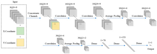 The network structure and parameter settings of the CNN-SLI model are similar to those of the CNN model, with the only difference being the input layer of the CNN-SLI model, which requires the input of the concatenated image data generated from the normalized spatial location information and the normalized patch image in the channel dimension. Figure 6 illustrates the structure of the CNN-SLI model.