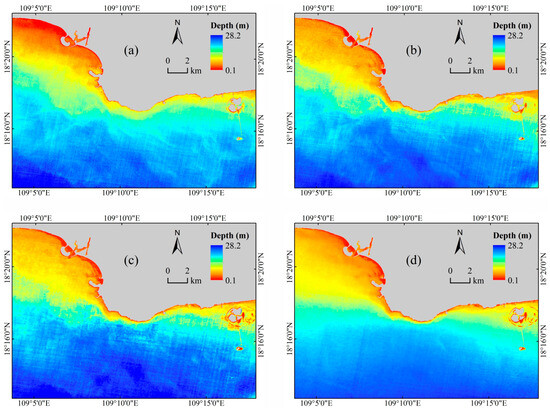 Inverted water depth maps for Nanshan Port. (a) Lyzenga model. (b) MLP model. (c) CNN model. (d) CNN-SLI model.