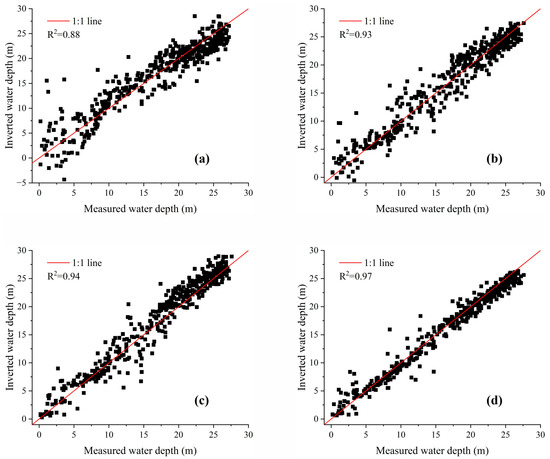 Scatter plots of inverted water depth and measured water depth for Nanshan Port. (a) Lyzenga model. (b) MLP model. (c) CNN model. (d) CNN-SLI model.