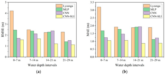 As can be seen from Table 6 and Figure 9, the CNN-SLI model has the most ideal inversion results at all water depth intervals and achieves the lowest RMSE and MAE in both shallow and deep waters. The RMSE and MAE of the CNN-SLI model are 0.14–2.65 m and 0.19–2.15 m lower than other models, respectively. The performance advantage of the CNN-SLI model is particularly obvious at the water depth intervals of 7–14 m and 14–21 m. At the water depth intervals of 0–7 m and 7–14 m, the RMSE and MAE of the CNN model are lower than those of the MLP model (the RMSE is maximally lower by 0.75 m and MAE is maximally lower by 0.44 m), while at the water depth intervals of 14–21 m and 21–29 m, the RMSE and MAE of the CNN model are slightly higher than those of the MLP model (the maximum RMSE is 0.11 m higher and the MAE is maximum 0.1 m higher). The Lyzenga model achieved the highest RMSE and MAE at almost all water depth intervals and only had a slight advantage over the MLP and CNN models at the water depth interval of 14–21 m. In conclusion, the CNN-SLI model proves to be more suitable for water depth inversion in both deep and shallow waters compared to the other models.